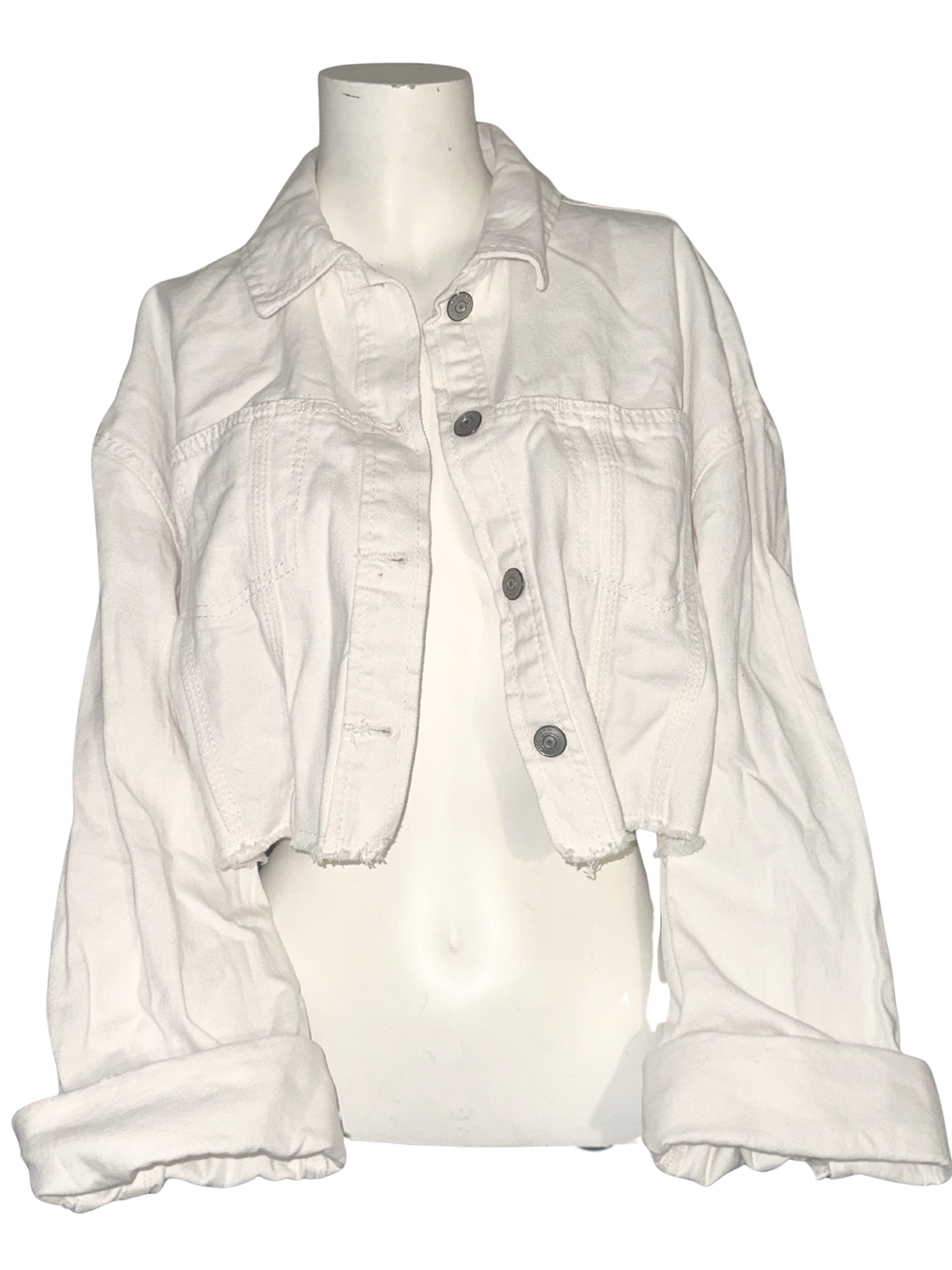 crop style, frayed edge trim button closure